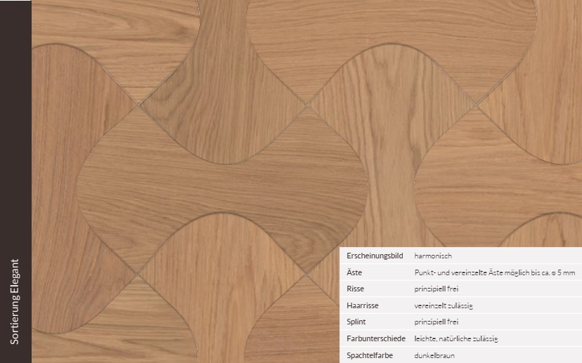 Das Holz darf auf der Oberseite keine Äste*, Splinte und Risse aufweisen. Es sind keine großen Farb- und Struktur- unterschiede erlaubt. Die Teile werden sowohl mit Sehnenschnitt aus auch mit Spiegelschnitt verarbeitet.