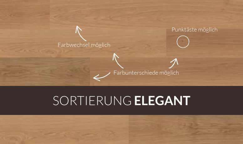 Jede Sortierung hat ihren ganz eigenen Charakter und bestimmt die Gesamtwirkung. Je nach Ausprägung von Ästen, Splint und Farbunterschieden wirkt der Boden ruhig und elegant bis zu lebhaft und rustikal.